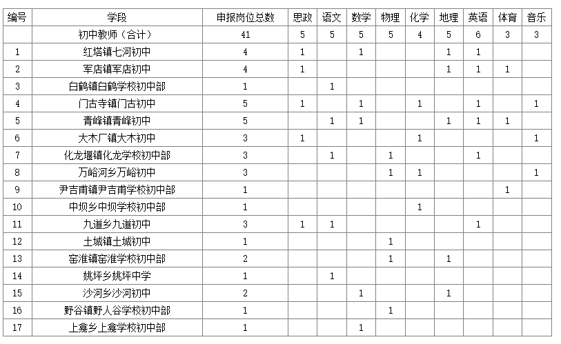 ?。ㄒ唬┑胤阶灾髡衅皋r(nóng)村教師崗位(初中41名):