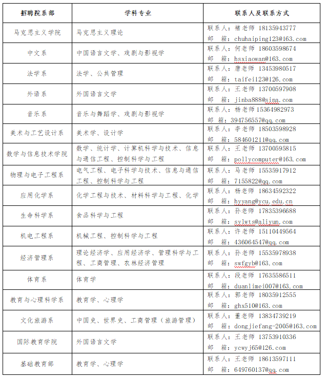 符合條件的國(境)內外高校博士研究生通過電子郵箱報名應聘,應聘人員請將個人簡歷電子版發(fā)送至各院系部聯(lián)系人電子郵箱和ycxyrsc@ycu.edu.cn。應聘者郵件標題格式統(tǒng)一要求為:姓名+性別+學科(專業(yè))。
