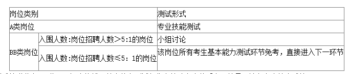 3.基本能力測(cè)試主要采取專業(yè)技能測(cè)試、小組討論等形式,對(duì)考生進(jìn)行考察。各崗位具體考核形式見下表。