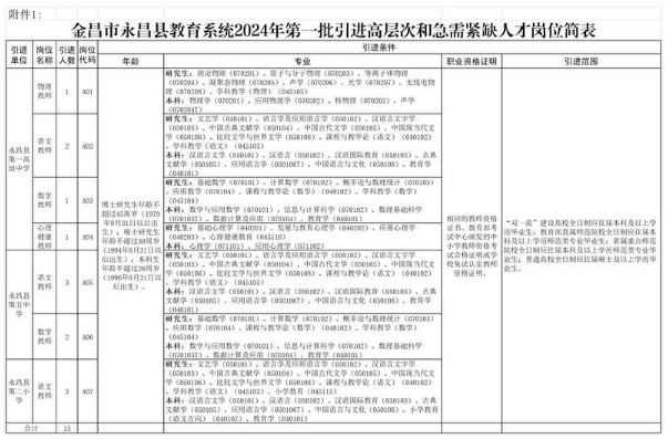 1.金昌市永昌縣教育系統(tǒng)2024年第一批引進(jìn)高層次和急需緊缺人才崗位簡(jiǎn)表