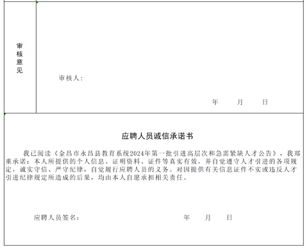 2.報(bào)名方式:采取網(wǎng)上報(bào)名和現(xiàn)場(chǎng)報(bào)名相結(jié)合的方式進(jìn)行。報(bào)名前,應(yīng)聘人員認(rèn)真查閱《公告》,仔細(xì)閱讀“應(yīng)聘人員誠(chéng)信承諾書(shū)”和引進(jìn)崗位條件,填寫(xiě)《金昌市永昌縣教育系統(tǒng)2024年第一批引進(jìn)高層次和急需緊缺人才報(bào)名表》(見(jiàn)附件2,以下簡(jiǎn)稱(chēng)《報(bào)名表》),每位應(yīng)聘者只允許選擇填報(bào)1個(gè)崗位,各崗位具體引進(jìn)條件以《崗位簡(jiǎn)表》為準(zhǔn)。因個(gè)人填報(bào)信息錯(cuò)誤而導(dǎo)致的其他后果,由應(yīng)聘者本人承擔(dān)。應(yīng)聘人員提供的報(bào)名材料應(yīng)真實(shí)準(zhǔn)確,偽造或變?cè)煊嘘P(guān)證件、材料、信息,提供虛假報(bào)名材料的應(yīng)聘人員,一經(jīng)發(fā)現(xiàn)即取消資格并按照有關(guān)規(guī)定處理。
