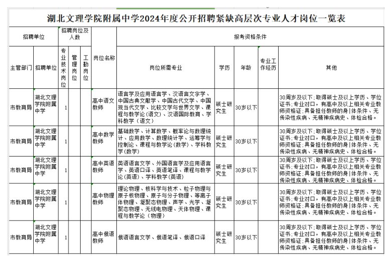 湖北文理學院附屬中學2024年度公開招聘緊缺高層次專業(yè)人才公告