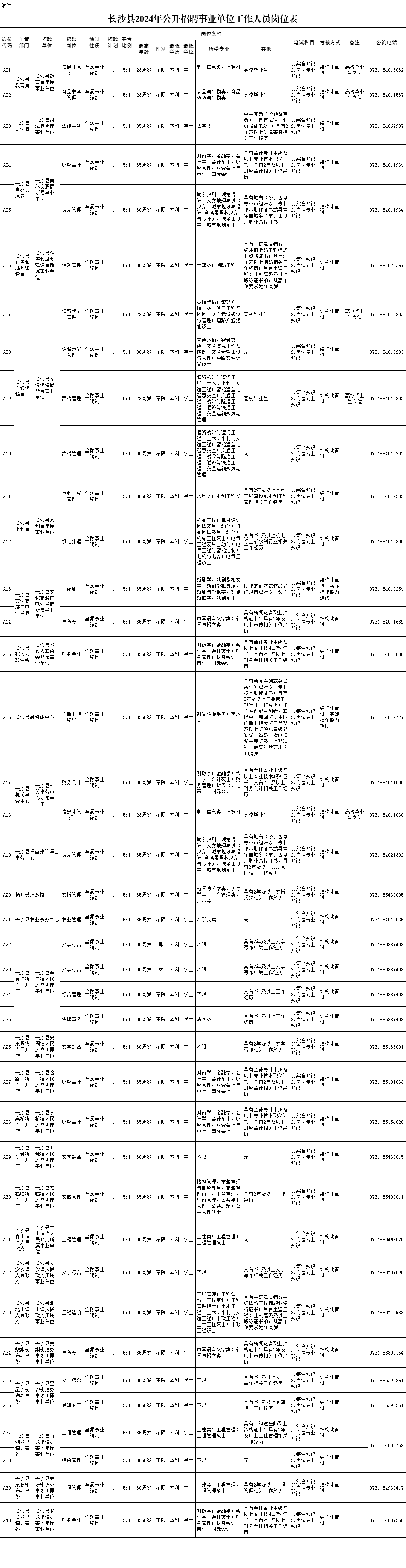 1.長沙縣2024年公開招聘事業(yè)單位工作人員崗位表