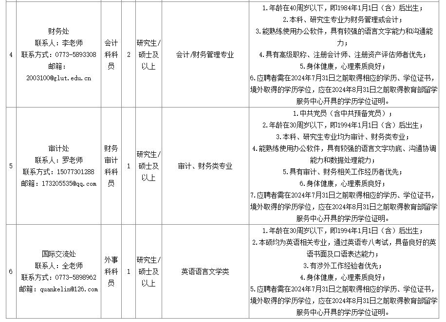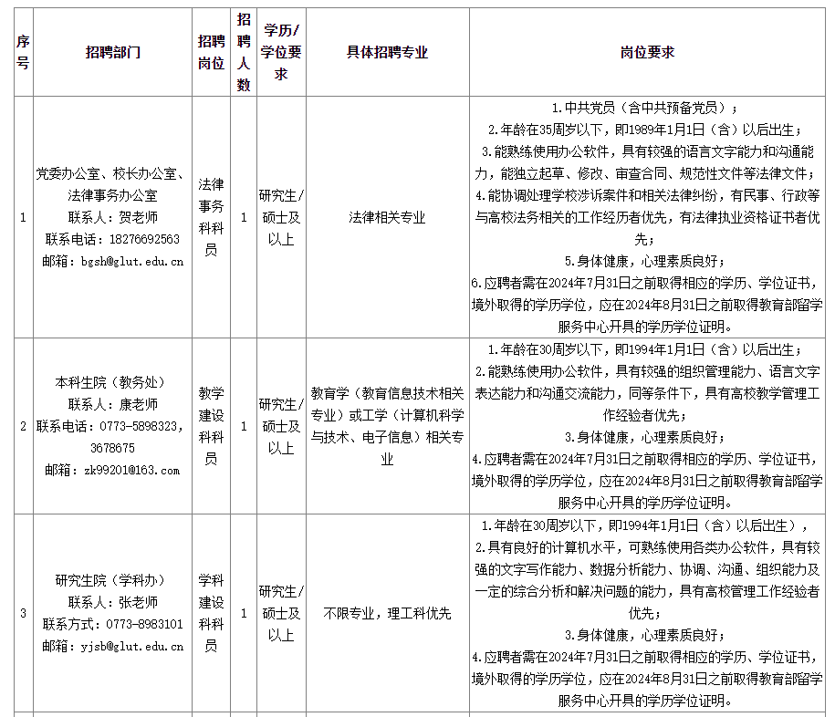 具體招聘事宜請(qǐng)聯(lián)系各招聘部門負(fù)責(zé)人;其他未盡事宜請(qǐng)聯(lián)系人事處咨詢,聯(lián)系人:丑老師或周老師,聯(lián)系電話:0773-2670319。