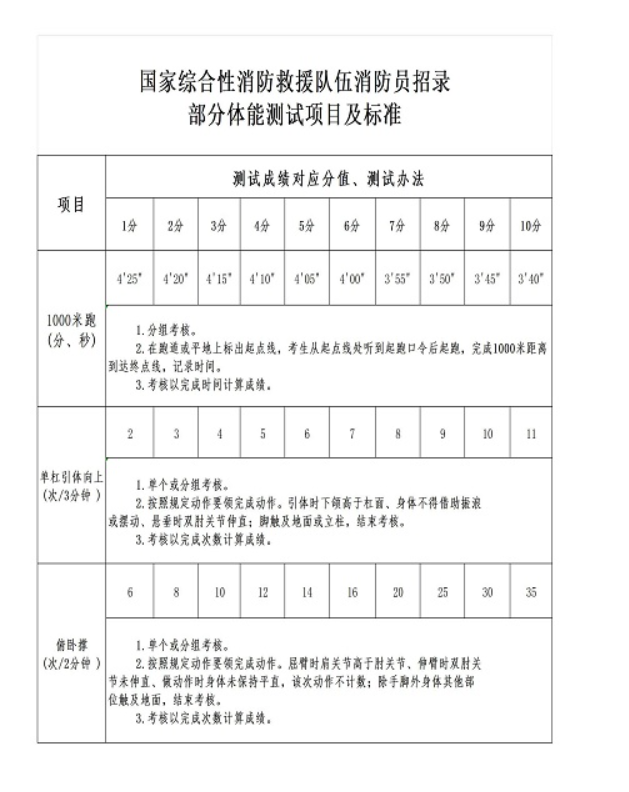 ?。ǘ┵Y格審查通過者全部參加體能測試,測試項目:1000米、俯臥撐、單杠引體向上??己藰藴拾凑铡秶揖C合性消防救援隊伍消防員招錄體能測試標準》執(zhí)行。
