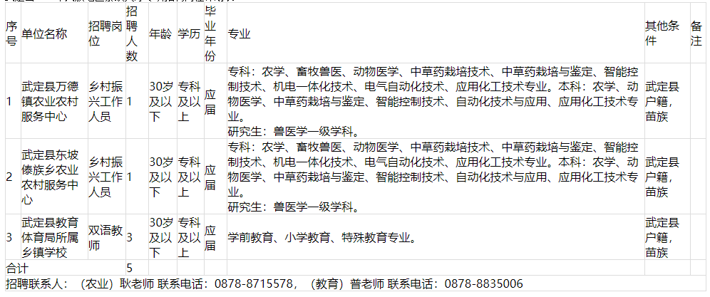 武定縣東坡傣族鄉(xiāng)農(nóng)業(yè)農(nóng)村服務(wù)中心工作人員1名;武定縣萬德鎮(zhèn)農(nóng)業(yè)農(nóng)村服務(wù)中心工作人員1名;武定縣教育體育局所屬鄉(xiāng)鎮(zhèn)學(xué)校教師3名。詳見《武定縣2024年民族地區(qū)緊缺人才專項招聘崗位計劃表》(附件1)。