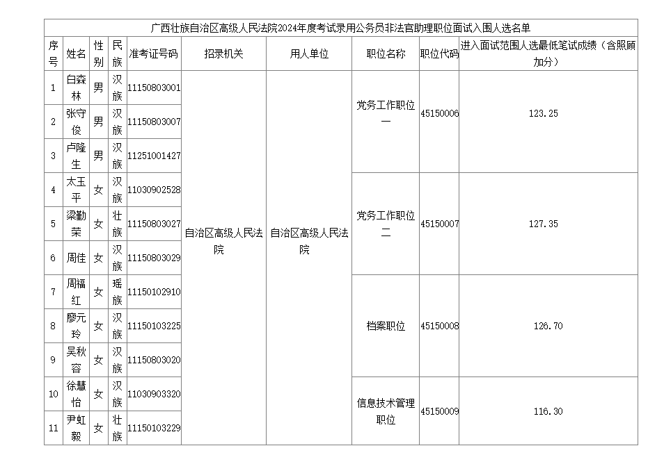 附件:1. 廣西壯族自治區(qū)高級人民法院2024年度考試錄用公務員非法官助理職位面試入圍人選名單