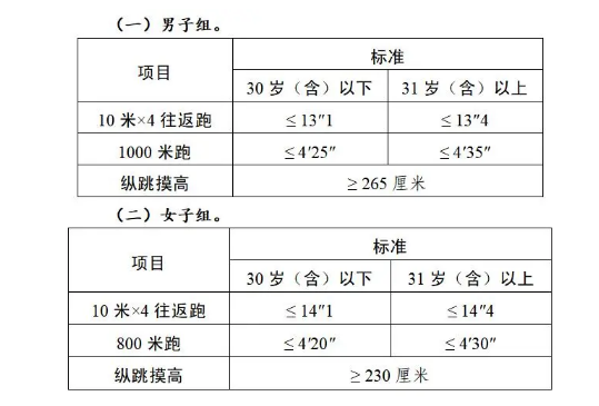 體能測(cè)評(píng)三項(xiàng)全部達(dá)標(biāo)方為合格。報(bào)考理化檢驗(yàn)、獄醫(yī)緊缺職位的人員,體能測(cè)評(píng)三項(xiàng)中有兩項(xiàng)達(dá)標(biāo)的,視為合格。