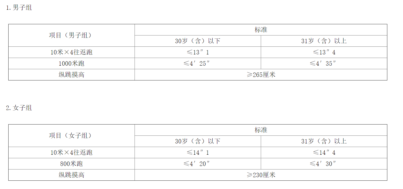 (四)體能測(cè)評(píng)的項(xiàng)目和標(biāo)準(zhǔn)。體能測(cè)評(píng)執(zhí)行《公安機(jī)關(guān)錄用人民警察體能測(cè)評(píng)項(xiàng)目和標(biāo)準(zhǔn)》和《公安機(jī)關(guān)錄用人民警察體能測(cè)評(píng)實(shí)施規(guī)則》有關(guān)規(guī)定,縱跳摸高每人最多可測(cè)3次,10米×4往返跑每人最多可測(cè)2次,男子1000米(女子800米)每人最多可測(cè)1次。體能測(cè)評(píng)的項(xiàng)目和標(biāo)準(zhǔn)如下: