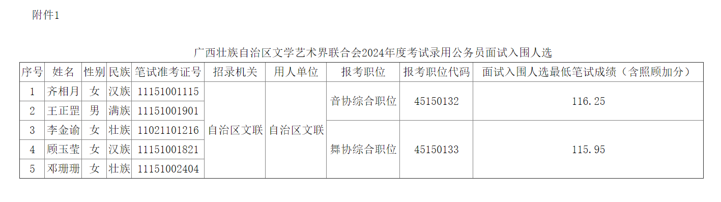 附件1:廣西壯族自治區(qū)文學藝術界聯(lián)合會2024年度考試錄用公務員面試入圍人選