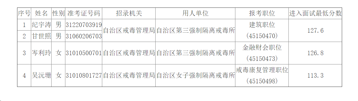 根據(jù)《廣西壯族自治區(qū)2024年度考試錄用公務(wù)員公告》有關(guān)規(guī)定,經(jīng)面試(體能測評)資格審查,因部分考生放棄面試(體能測評)資格或資格審查不合格。按照同一職位筆試合格人員筆試總成績(筆試總成績=行政職業(yè)能力測驗成績+申論成績+少數(shù)民族照顧加分)從高分到低分的順序依次遞補。面試入圍人選資格審查通告發(fā)布2日后,如有報考人員放棄面試資格或資格審查不合格的,不再遞補。現(xiàn)將廣西壯族自治區(qū)戒毒管理局2024年度考試錄用公務(wù)員(人民警察)遞補入圍面試(體能測評)資格審查人選公告如下:
