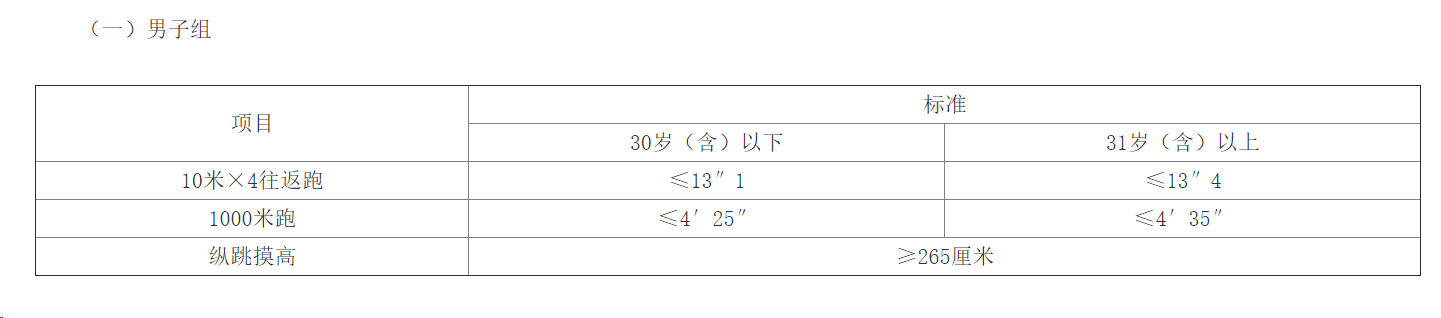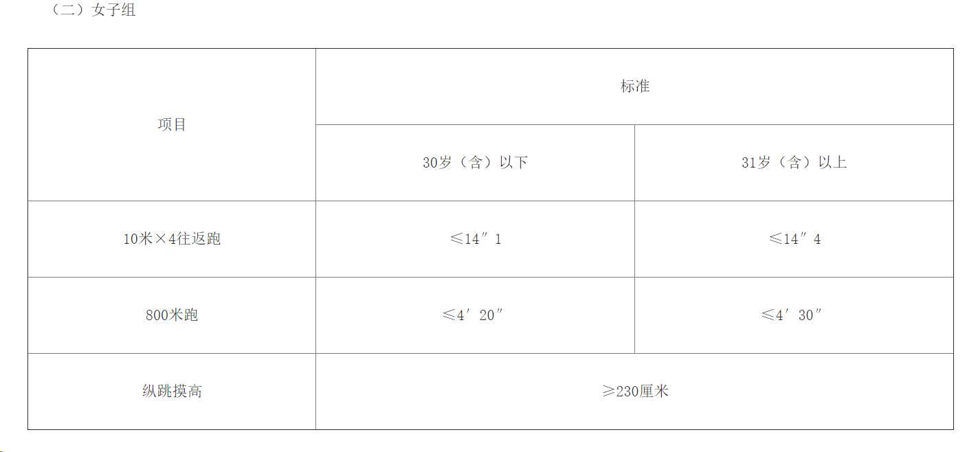體能測評三項全部達標方為合格。報考緊缺職位的人員,體能測評項目三項中有兩項達標的,視為合格。體能測評項目中,縱跳摸高項目的測評次數(shù)不超過3次,10米×4往返跑項目的測評次數(shù)不超過2次,男子1000米、女子800米跑項目的測評次數(shù)為1次。