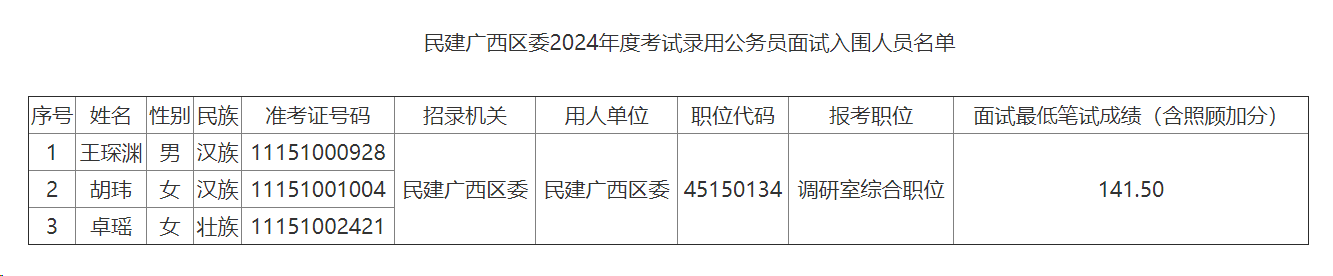 根據(jù)自治區(qū)公務(wù)員主管部門劃定的2024年度考試錄用公務(wù)員公共科目筆試合格分?jǐn)?shù)線和規(guī)定比例,按照筆試總成績(jī)(筆試總成績(jī)=行政職業(yè)能力測(cè)驗(yàn)+申論成績(jī)+少數(shù)民族照顧加分)從高分到低分的順序,并經(jīng)資格審查確定王琛淵等3名考生進(jìn)入面試(名單詳見(jiàn)附1)。