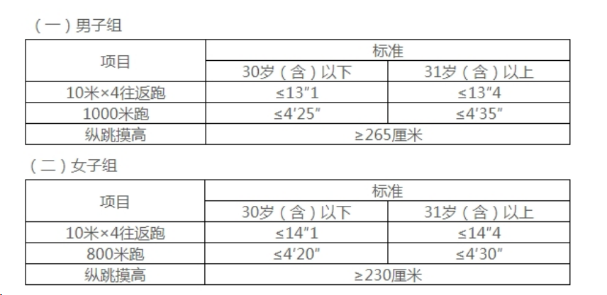 體能測(cè)評(píng)三項(xiàng)全部達(dá)標(biāo)方為合格。報(bào)考緊缺職位的人員,體能測(cè)評(píng)項(xiàng)目3項(xiàng)中有2項(xiàng)達(dá)標(biāo)的,視為合格。體能測(cè)評(píng)項(xiàng)目中,縱跳摸高的測(cè)試次數(shù)不超過(guò)3次(當(dāng)場(chǎng)),10米×4往返跑的測(cè)試次數(shù)不超過(guò)2次(當(dāng)場(chǎng)),男子1000米跑和女子800米跑項(xiàng)目的測(cè)試次數(shù)均為1次。年齡計(jì)算時(shí)間截止到參加體能測(cè)評(píng)當(dāng)月。