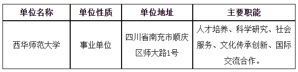 根據(jù)《事業(yè)單位人事管理條例》《事業(yè)單位公開招聘人員暫行規(guī)定》和《四川省省屬事業(yè)單位公開招聘工作人員實施細(xì)則(試行)》等有關(guān)規(guī)定,經(jīng)四川省教育廳備案,我單位擬面向社會公開招聘20名工作人員?,F(xiàn)將公開招聘有關(guān)事項公告如下(本公告同時在四川省人力資源和社會保障廳(以下簡稱省人社廳)官網(wǎng)[http://rst.sc.gov.cn/,下同]“人事考試”專欄、省教育廳官網(wǎng)[http://edu.sc.gov.cn/,下同]和西華師范大學(xué)官網(wǎng)[https://www.cwnu.edu.cn/,下同]上發(fā)布)。