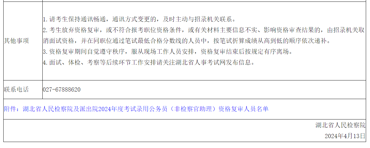 2024年湖北省人民檢察院及派出院公務(wù)員考試(非檢察官助理)資格復審公告