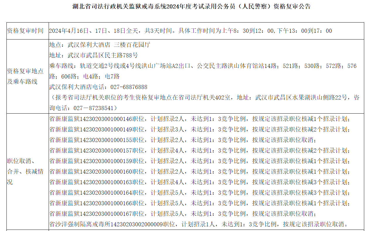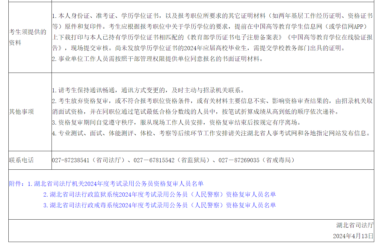 附件:1.湖北省司法廳機關2024年度考試錄用公務員資格復審人員名單 2.湖北省司法行政監(jiān)獄系統(tǒng)2024年度考試錄用公務員(人民警察)資格復審人員名單 3.湖北省司法行政戒毒系統(tǒng)2024年度考試錄用公務員(人民警察)資格復審人員名單