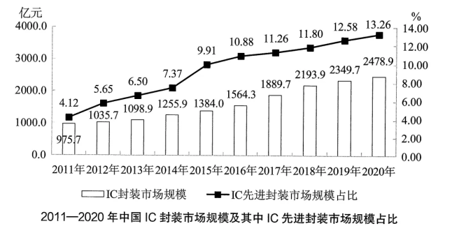 定位圖形資料可知,2020年、2019年中國(guó)IC封裝市場(chǎng)規(guī)模分別2478.9億元、2349.7億元;IC先進(jìn)封裝市場(chǎng)規(guī)模占比分別為13.26%、12.58%。