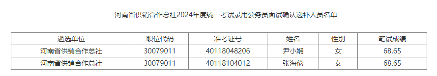 河南省供銷合作總社2024年統(tǒng)一考試錄用公務(wù)員面試確認(rèn)遞補(bǔ)公告