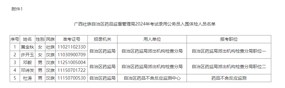 廣西壯族自治區(qū)藥品監(jiān)督管理局根據(jù)計劃錄用人數(shù)與體檢人選1:1的比例,按照同一職位報考人員的綜合成績〔綜合成績=筆試總成績x50%+面試成績〕從高分到低分的順序,確定黃金秋等5人為我單位2024年度考試錄用公務(wù)員(參照公務(wù)員法管理單位工作人員)體檢人員(名單見附件1)。