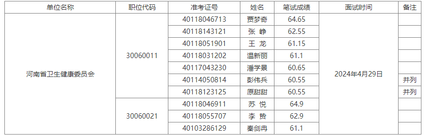 根據(jù)《河南省2024年度統(tǒng)一考試錄用公務員公告》,現(xiàn)將河南省衛(wèi)生健康委員會面試有關事項公告如下: