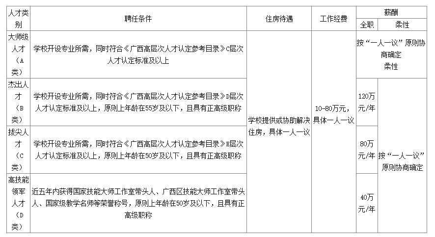 符合《廣西電力職業(yè)技術(shù)學(xué)院高層次人才(高水平團隊)引進和管理辦法(試行)》(桂電職院〔2021〕24號)文件關(guān)于人才分類中A類-D類認定條件,經(jīng)學(xué)校認定,明確人才類別及考核目標(biāo)和工作任務(wù)后,符合條件的人員可以享受以下待遇: