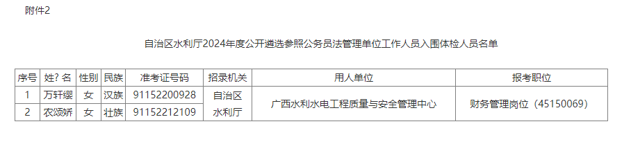 2. 自治區(qū)水利廳2024年度公開遴選參照公務(wù)員法管理單位工作人員入圍體檢人員名單