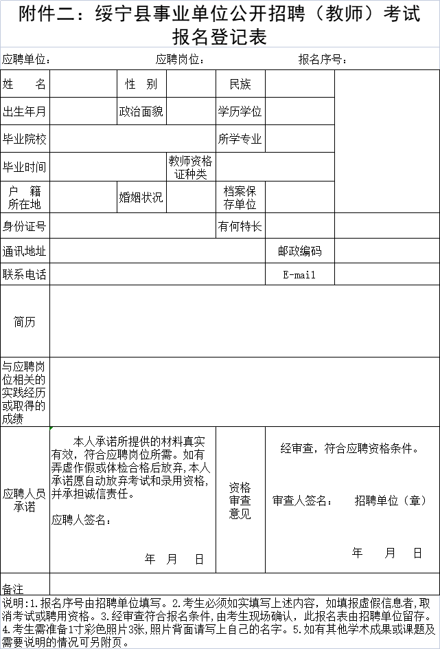 二、綏寧縣事業(yè)單位公開招聘(教師)考試報(bào)名登記表