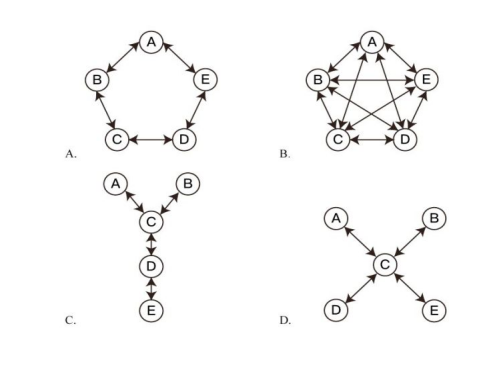 【答案】D【解析】第一步:找出定義要點。輪式網(wǎng)絡(luò):“一個下級同時與多個主管聯(lián)系”、“主管之間沒有溝通的情形”;Y式網(wǎng)絡(luò):“第二級有兩個上級與之聯(lián)系”、“第三級與一個或更多下級發(fā)生聯(lián)系”;環(huán)式網(wǎng)絡(luò):“每個成員僅與相鄰者聯(lián)系”、“不能與更遠的成員進行溝通”;全通道式網(wǎng)絡(luò):“所有成員間充分進行溝通”、“所有成員的地位是平等的,無核心人物”。第二步:逐一分析選項。A項:每個字符只與其相鄰的兩個字符間有聯(lián)系,與其他不相鄰的沒有聯(lián)系,符合“每個成員僅與相鄰者聯(lián)系”、“不能與更遠的成員進行溝通”,符合“環(huán)式網(wǎng)絡(luò)”定義,不符合“輪式網(wǎng)絡(luò)”定義,排除;B項:每個字符與其他所有字符都有聯(lián)系,而且無核心字符,符合“所有成員間充分進行溝通”、“所有成員的地位是平等的,無核心人物”,符合“全通道式網(wǎng)絡(luò)”定義,不符合“輪式網(wǎng)絡(luò)”定義,排除;C項:字符C分別與兩個上級字符A、B以及一個下級字符D有聯(lián)系,符合“第二級有兩個上級與之聯(lián)系”、“第三級與一個或更多下級發(fā)生聯(lián)系”,符合“Y式網(wǎng)絡(luò)”定義,不符合“輪式網(wǎng)絡(luò)”定義,排除;D項:字符C作為下屬時,分別與多個主管字符A、B、C、D有聯(lián)系,但是主管字符A、B、C、D之間沒有聯(lián)系,符合“一個下級同時與多個主管聯(lián)系”、“主管之間沒有溝通的情形”,符合“輪式網(wǎng)絡(luò)”定義,當選。