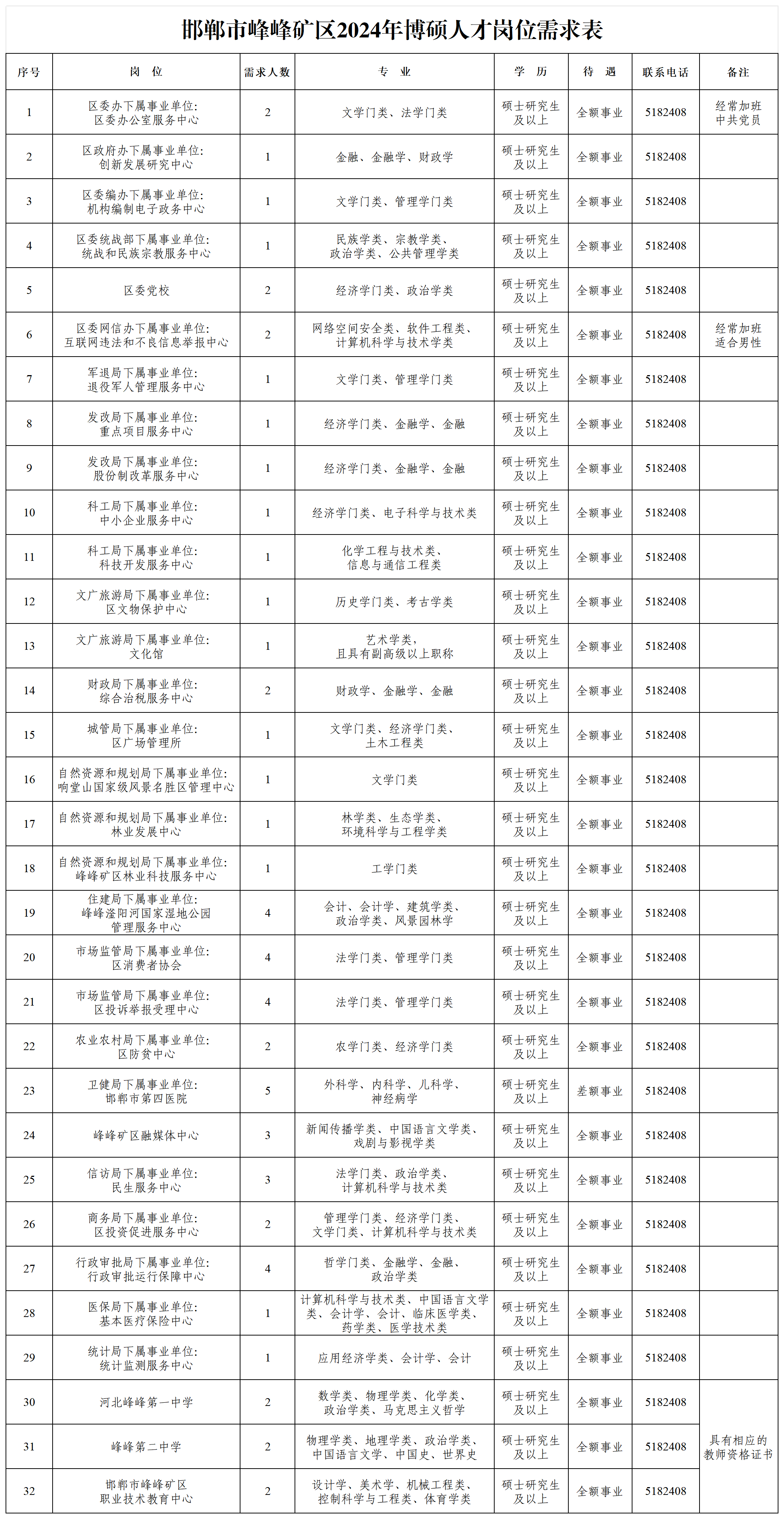 本次區(qū)屬事業(yè)單位共引進(jìn)博碩人才61名,工作崗位詳見附表《邯鄲市峰峰礦區(qū)2024年博碩人才崗位需求表》。