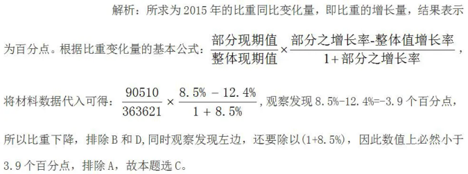 【答案】C【解析】題目的問法為比重的差值,單位為百分點,排除A、B。由題干條件,