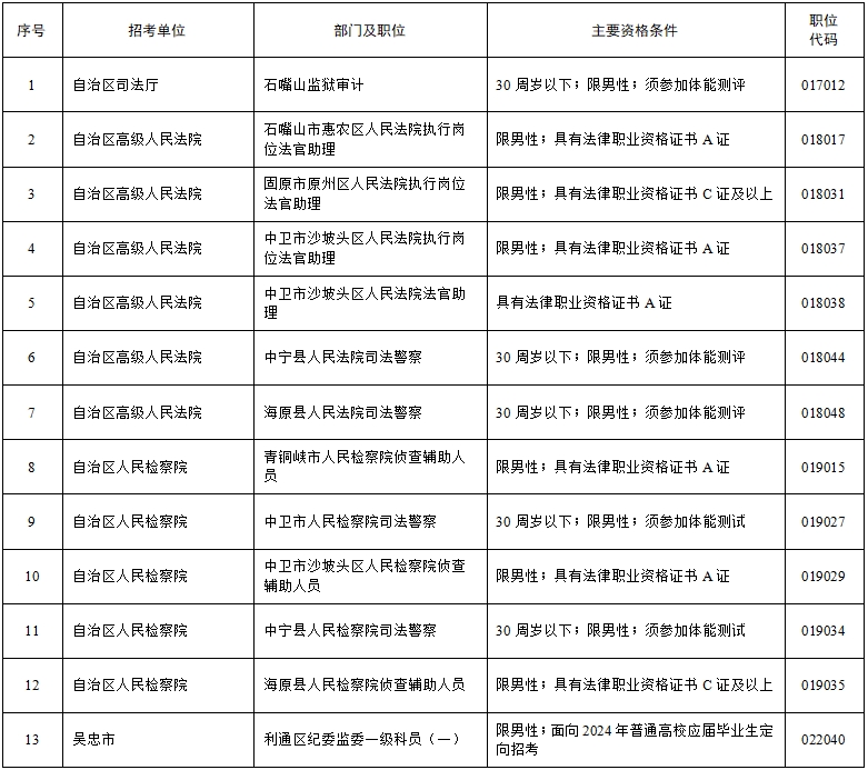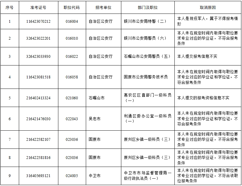 根據(jù)《寧夏回族自治區(qū)2024年考試錄用公務(wù)員公告》相關(guān)規(guī)定,自治區(qū)公務(wù)員局會同有關(guān)部門及各招錄機(jī)關(guān)對2024年全區(qū)考試錄用公務(wù)員擬進(jìn)入面試的報(bào)考者進(jìn)行了資格復(fù)審。復(fù)審中發(fā)現(xiàn),部分報(bào)考者不符合職位資格條件,部分報(bào)考者放棄面試資格,個(gè)別職位達(dá)不到面試開考比例。經(jīng)自治區(qū)公務(wù)員主管部門研究,決定取消部分報(bào)考者面試資格,降低部分職位面試開考比例。現(xiàn)將有關(guān)情況公告如下: