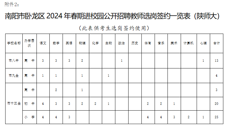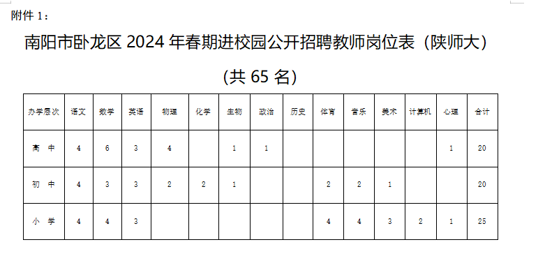 1、南陽市臥龍區(qū)2024年春期進(jìn)校園公開招聘教師崗位表(陜師大)