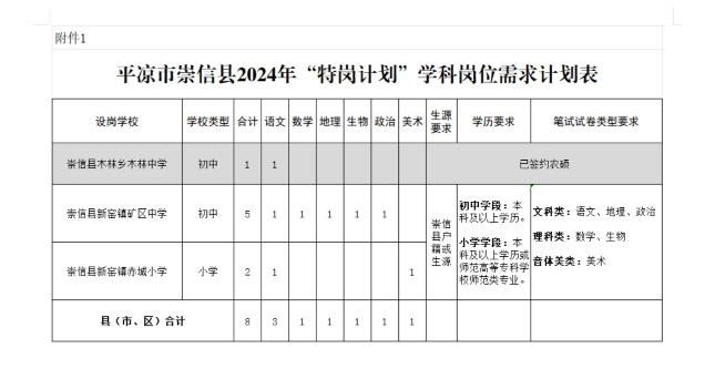 附件:1.崇信縣2024年“特崗計劃”教師招聘崗位設置表