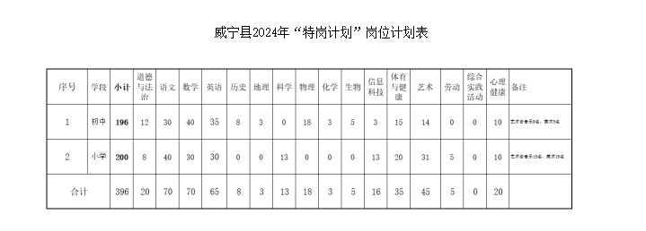 2024年,“特崗計(jì)劃”在我縣實(shí)施,共招聘396名。其中,初中196名,小學(xué)200名。具體分學(xué)科崗位招聘計(jì)劃詳見《威寧縣2024年“特崗計(jì)劃”教師招聘計(jì)劃表》(見附件1)。