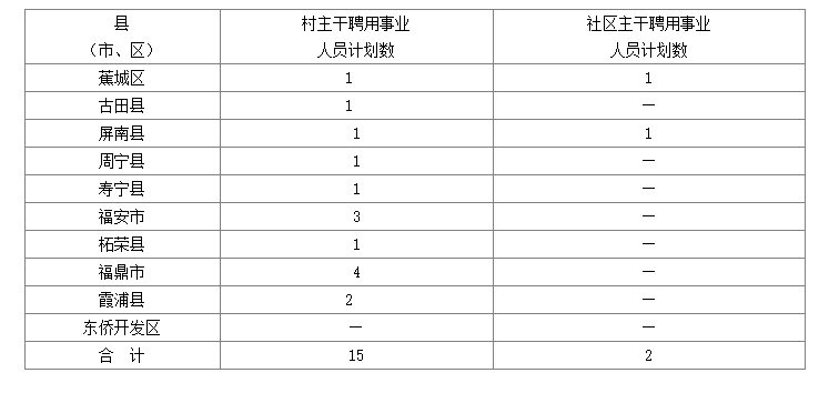 優(yōu)秀村主干除錄用為鄉(xiāng)鎮(zhèn)(街道)機關(guān)公務(wù)員外,各縣(市、區(qū))可從考錄鄉(xiāng)鎮(zhèn)(街道)機關(guān)公務(wù)員筆試成績合格的對象中,按筆試成績從高到低的順序,擇優(yōu)招聘鄉(xiāng)鎮(zhèn)(街道)事業(yè)單位工作人員15名,其中:蕉城區(qū)1名、古田縣1名、屏南縣1名、周寧縣1名、壽寧縣1名、福安市3名、柘榮縣1名、福鼎市4名、霞浦縣2名。