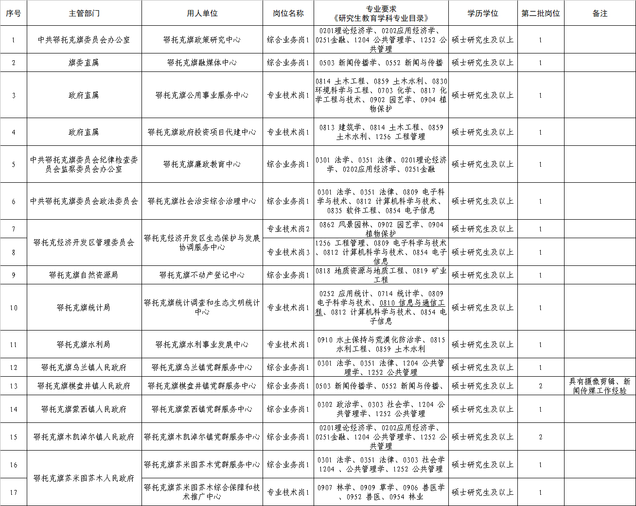 根據(jù)《鄂爾多斯市委 市人民政府印發(fā)〈關(guān)于實(shí)施更加積極開放有效人才政策打造一流人才高地的若干措施〉的通知》、《鄂爾多斯市事業(yè)單位引進(jìn)高層次人才和急需緊缺專業(yè)人才實(shí)施辦法》、《“智匯鄂托克”人才科創(chuàng)若干政策》和《鄂托克旗2024年度事業(yè)單位引進(jìn)高層次人才和緊缺專業(yè)人才實(shí)施方案》精神,經(jīng)鄂托克旗人才領(lǐng)導(dǎo)小組第二次會(huì)議研究決定,在后續(xù)市、旗兩級(jí)舉辦的校園招聘引才活動(dòng)中在引進(jìn)條件不變的情況下繼續(xù)引進(jìn),成熟一批引進(jìn)一批,現(xiàn)將鄂托克旗2024年度事業(yè)單位引進(jìn)高層次人才和緊缺專業(yè)人才空缺崗位第二批引進(jìn)有關(guān)事項(xiàng)公告如下: