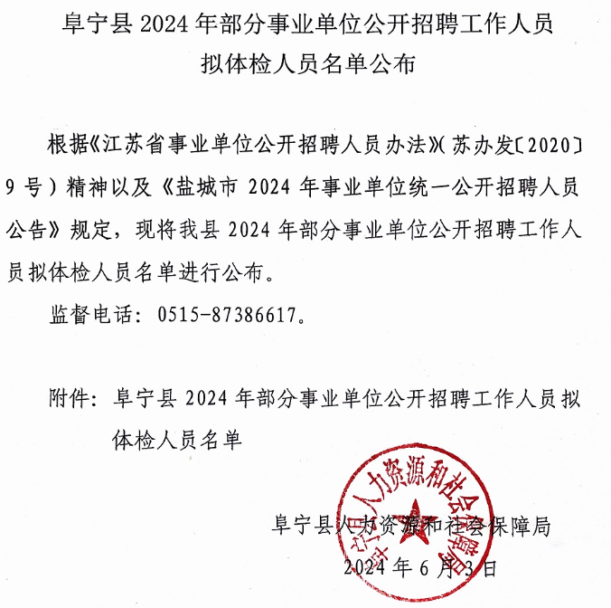 2024年江蘇鹽城阜寧縣部分事業(yè)單位招聘擬體檢人員名單公布