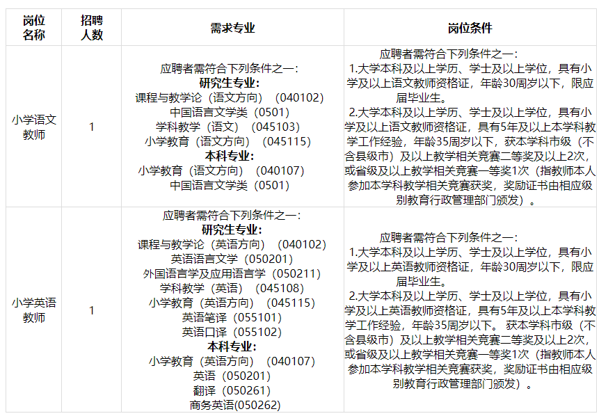 需求專業(yè)中“課程與教學(xué)論(040102)”專業(yè)考生如報考小學(xué)語文崗位需提供語文相關(guān)課程成績單;如報考小學(xué)英語崗位則需提供英語相關(guān)課程成績單;“小學(xué)教育(040107)”專業(yè)考生如報考小學(xué)語文崗位需提供語文相關(guān)課程成績單;如報考小學(xué)英語崗位則需提供英語相關(guān)課程成績單;