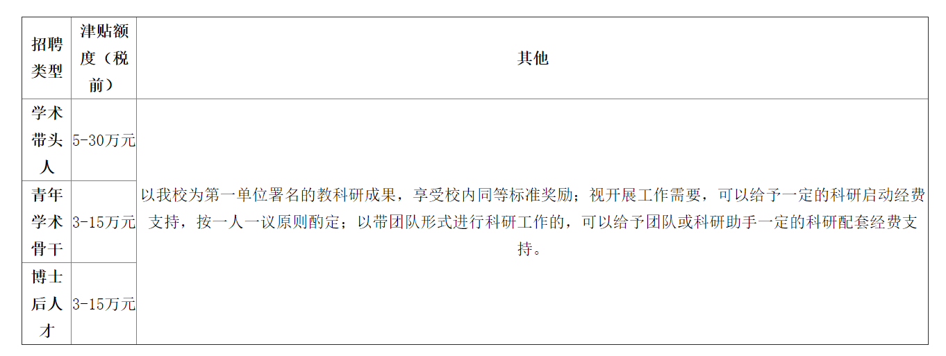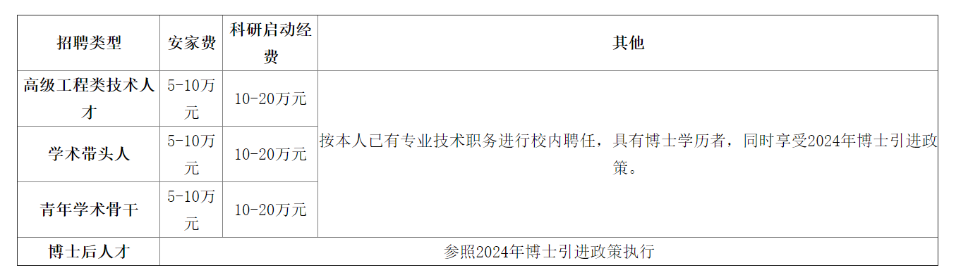 具體引進(jìn)待遇詳見(jiàn)下表,特別優(yōu)秀或特殊情況者一事一議,一人一策。