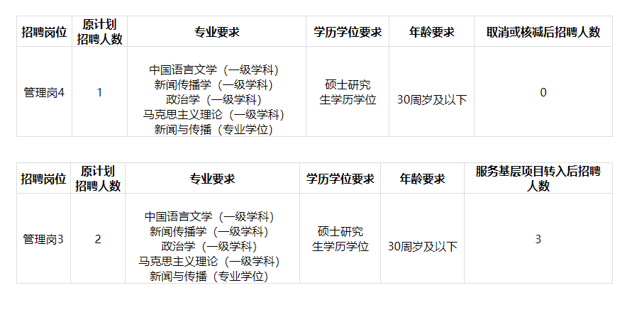 根據(jù)《山西醫(yī)科大學(xué)汾陽學(xué)院2024年公開招聘工作人員工作方案》要求,我院公開招聘資格審查工作已結(jié)束。根據(jù)公告要求和實際報名情況,按照“崗位資格審查合格人數(shù)與擬招聘人數(shù)原則上應(yīng)達3:1以上方可開考,報名人數(shù)不達該比例的招聘崗位,按規(guī)定的比例相應(yīng)核減崗位,如減少到1名仍達不到3:1的崗位,原則上取消招聘崗位”與“服務(wù)基層項目人員專門崗位在報名結(jié)束后未達規(guī)定比例被取消的,將崗位招聘計劃和報名人員轉(zhuǎn)入一般性崗位(轉(zhuǎn)入專業(yè)要求、其他要求等相同的崗位)”的規(guī)定,經(jīng)學(xué)院公開招聘領(lǐng)導(dǎo)組研究,決定將管理崗位4(服務(wù)基層項目人員專門崗位)取消,其崗位招聘計劃和報名人員轉(zhuǎn)入一般性崗位管理崗位3。具體如下:
