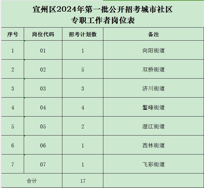 全區(qū)共招錄城市社區(qū)專職工作者17名(詳見崗位表),錄取后由所在街道統(tǒng)一分配至所轄社區(qū)工作。