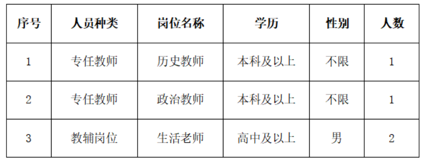因學校實際用人需求,現(xiàn)招聘專任教師2名、教輔崗位2名。其中,歷史教師1名、政治教師1名、生活老師2名(男)。