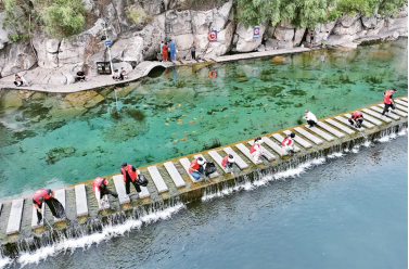 2024年6月5日是世界環(huán)境日。世界環(huán)境日前后,各地志愿者、環(huán)保工作者等以實(shí)際行動(dòng)保護(hù)生態(tài)環(huán)境,守護(hù)美麗家園。圖為2024年6月4日,志愿者在河北省邯鄲市峰峰礦區(qū)黑龍洞風(fēng)景區(qū)撿拾水面雜物。新華社發(fā) 郝群英/攝