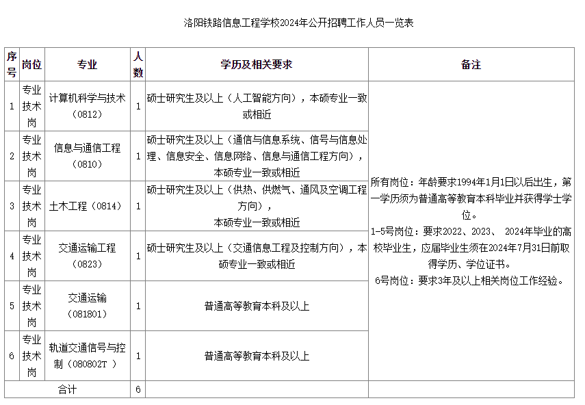 本次面向社會公開招聘工作人員6名,具體專業(yè)、人數(shù)等詳見《洛陽鐵路信息工程學校2024年公開招聘工作人員一覽表》(附件1)。