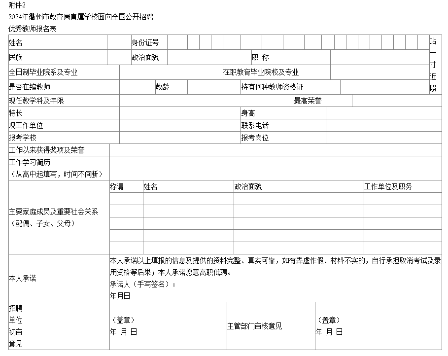 2.2024年衢州市教育局直屬學(xué)校面向全國公開招聘優(yōu)秀教師報名表