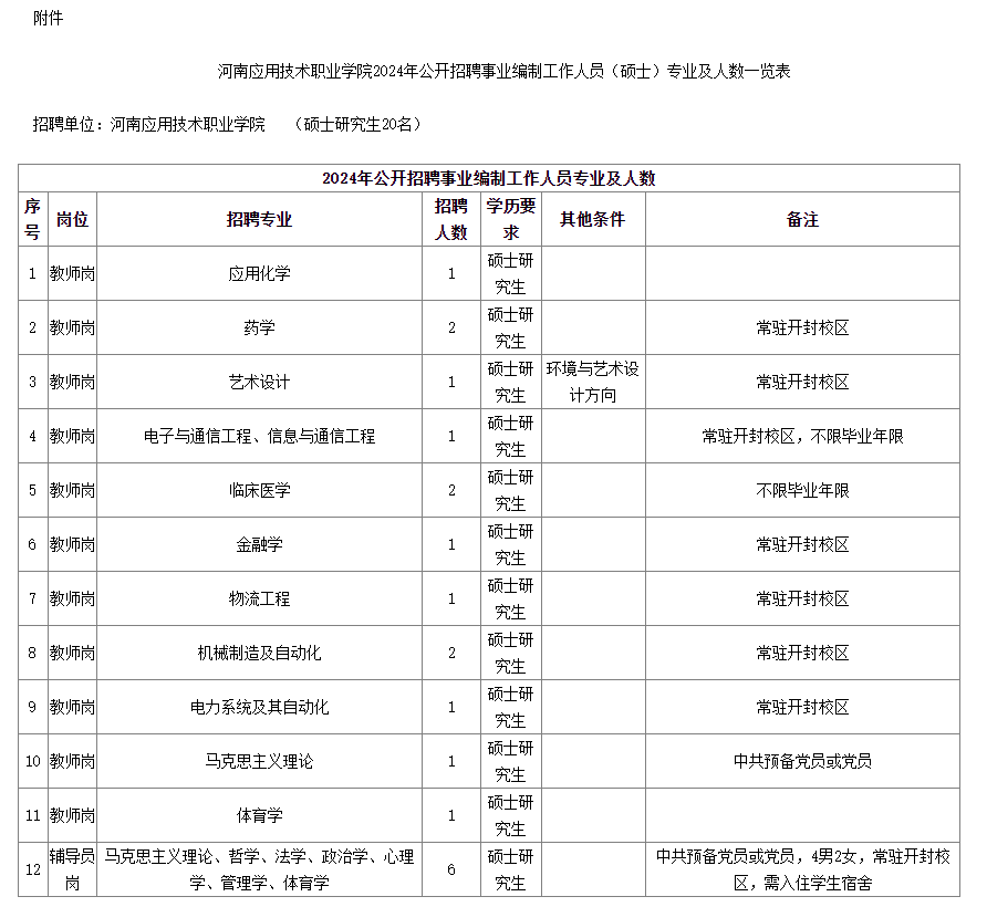 根據(jù)我校專業(yè)技術(shù)人員崗位空缺情況和學(xué)校發(fā)展需要,擬招碩士研究生20名。詳見附件1《河南應(yīng)用技術(shù)職業(yè)學(xué)院2024年公開招聘事業(yè)編制工作人員(碩士)專業(yè)及人數(shù)一覽表》。