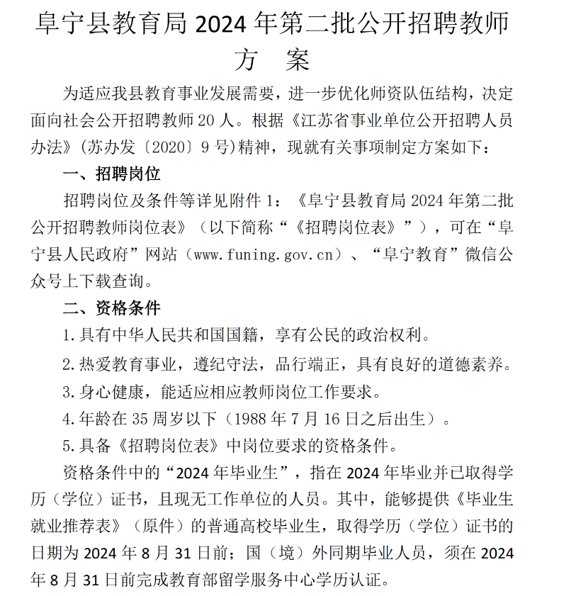 2024年江蘇鹽城阜寧縣教育局招聘教師20人方案