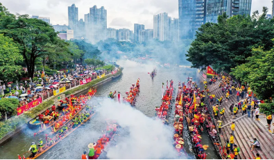 中國(guó)式現(xiàn)代化是物質(zhì)文明和精神文明相協(xié)調(diào)的現(xiàn)代化。獵德村是位于廣東廣州珠江新城一座歷史悠久的古村。每年端午期間,獵德村民都會(huì)遵照嶺南龍舟文化習(xí)俗,在祠堂和河涌,用各種充滿儀式感的“龍船景”展示對(duì)端午文化的傳承。圖為2024年6月10日,十里八鄉(xiāng)的龍舟匯聚在獵德涌參加“龍船景”。新華社記者劉大偉/攝