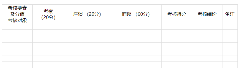 備注:1.考察重點(diǎn)考察其在政治思想、道德品質(zhì)、能力素養(yǎng)、遵紀(jì)守法、廉潔自律、崗位匹配等方面的情況以及學(xué)習(xí)工作的表現(xiàn);2.座談重點(diǎn)了解其是否具有專業(yè)技術(shù)、科技素質(zhì)和工作能力;3.面談重點(diǎn)了解其綜合分析能力、應(yīng)急應(yīng)變能力、組織協(xié)調(diào)能力和語言理解與表達(dá)能力等。
